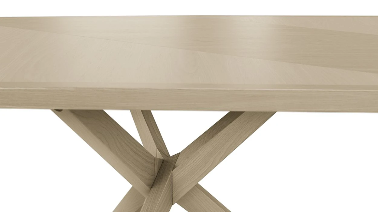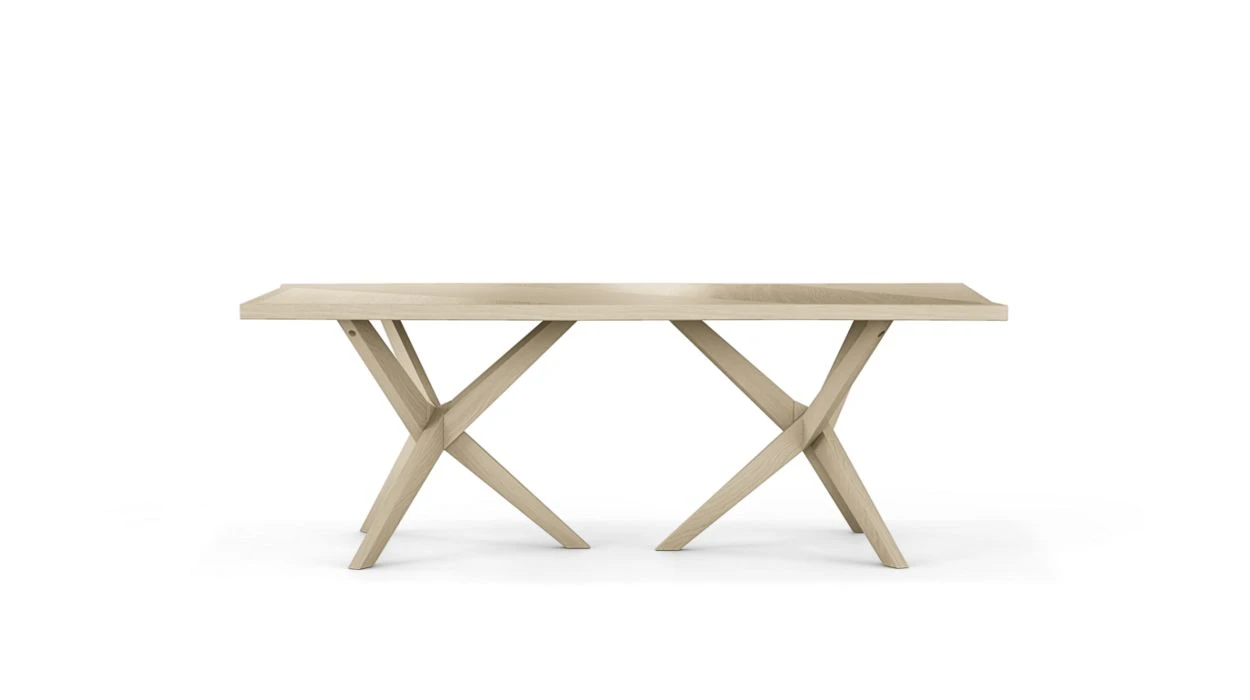The Jane table is the culmination of Christophe Delcourt’s research on the theme of modernity and wood. Each of the two bases are solid oak tripods that intertwine to create dynamic movement. Optional patinated metal blades can be added to the base to emphasize the design. The unconventional top features slightly offset edges and an oak veneer that alternates directions to highlight the unique shape.