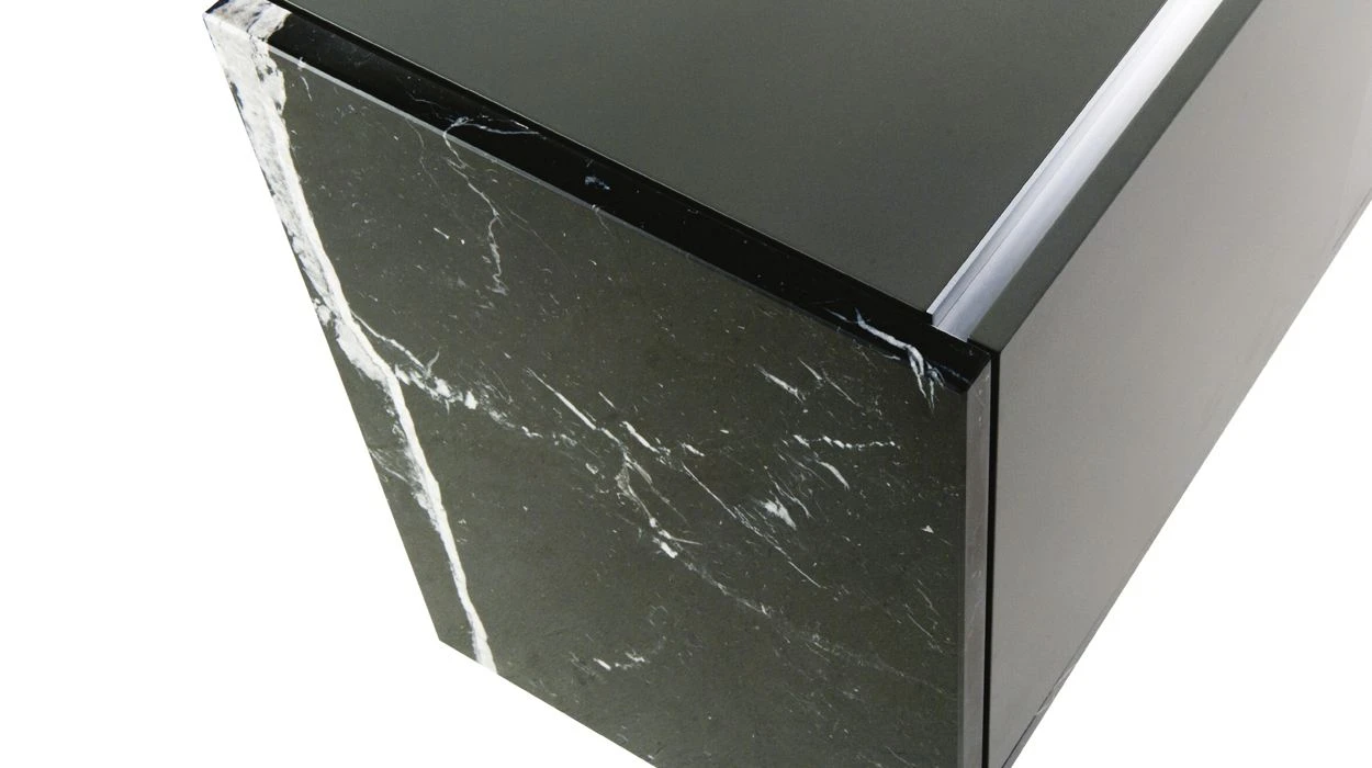 Structure with metallic lacquer finish (3 colours), handles in aluminium (2 colours). Interior with metallic lacquer finish matching the colour of the structure and four 8mm-thick glass shelves. Base in Nero Marquina marble.