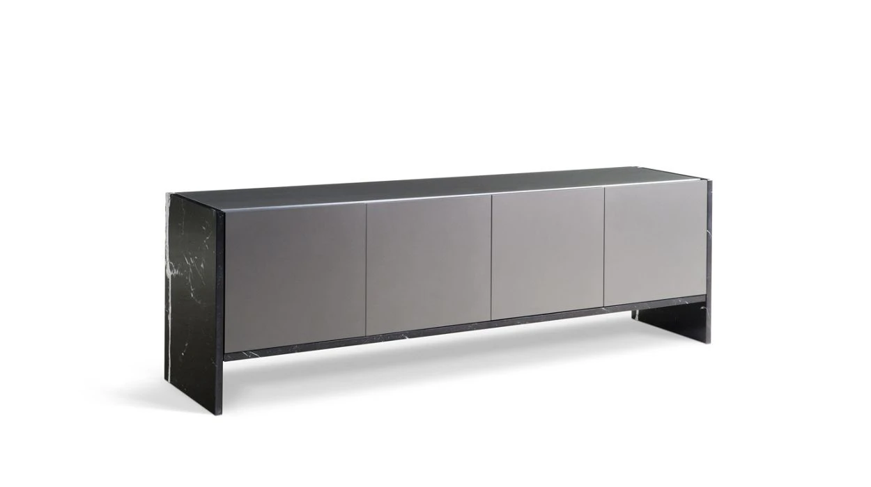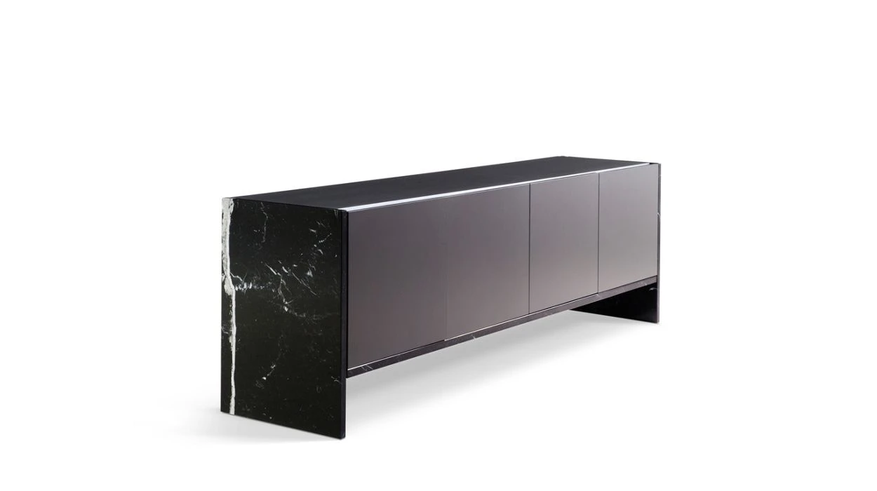 Thick marble slabs (Marquina, Rosso Levanto, etc.) are used in the dynamic H-shaped structure of this contemporary and sober sideboard.