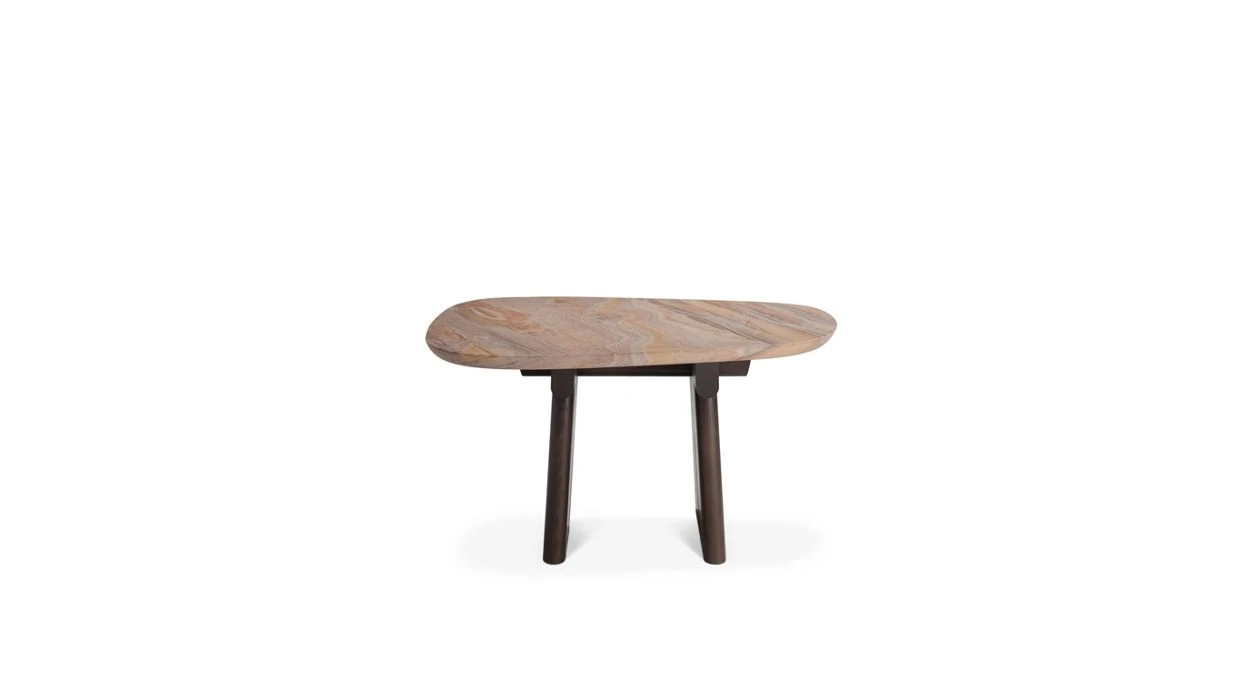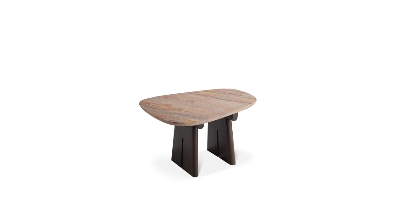 Japanese-inspired, the top of the Kumo cocktail table is split into two irregularly shaped but equally-sized pieces. The matching end table features one of these shapes. The trays are made of sand stone, a warm-toned mineral from Rajasthan, and evoke the idea of water receding across ancient stone. The sandblasted and black stained solid ash bases complete the design.