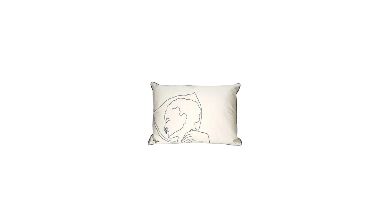 Cushion from Jean Cocteau Collection bedding set in cotton satin, col. Coquille (shell). Front with “dormeur” (sleeper) embroidered pattern and back with screenprinted ‘Je reste avec vous’ (‘I’ll stay with you’). Black velvet piping. Removable cover.