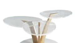 Cocktail table with 3 tops in engraved colourless Altuglas (PMMA), legs in solid oak with white ceruse finish, base in steel with lacquer finish, col. white.
