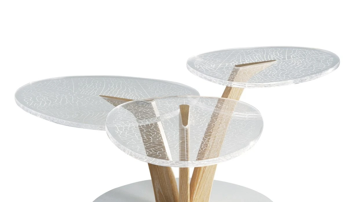 This piece evokes the idea of leaves at the end of branches. It features a lacquered steel base and limed solid oak supports for the trays. The delicate engraving work on the transparent plexiglass trays creates a white pattern that resembles veining.