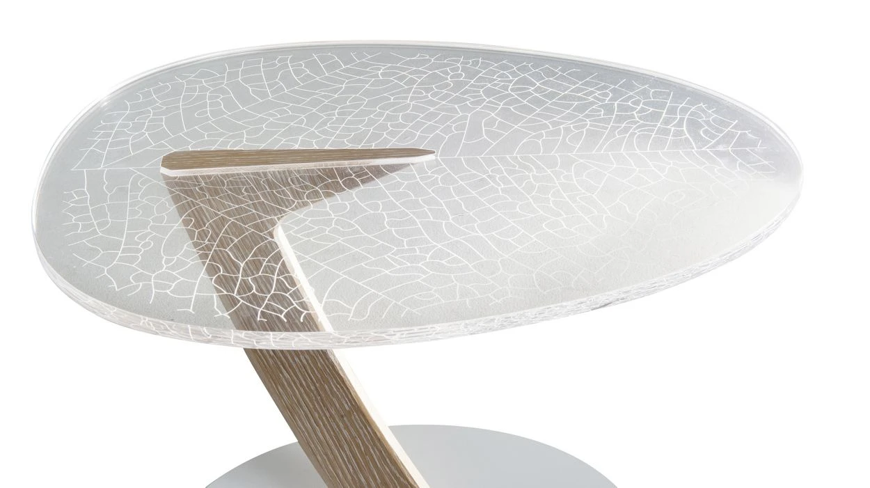 This piece evokes the idea of leaves at the end of branches. It features a lacquered steel base and limed solid oak supports for the trays. The delicate engraving work on the transparent plexiglass trays creates a white pattern that resembles veining.