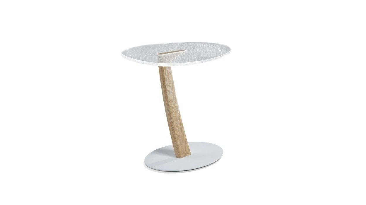 Occasional table with 3 tops in engraved colourless Altuglas (PMMA), legs in solid oak with white ceruse finish, base in steel with lacquer finish, col. white.