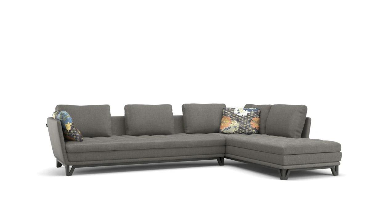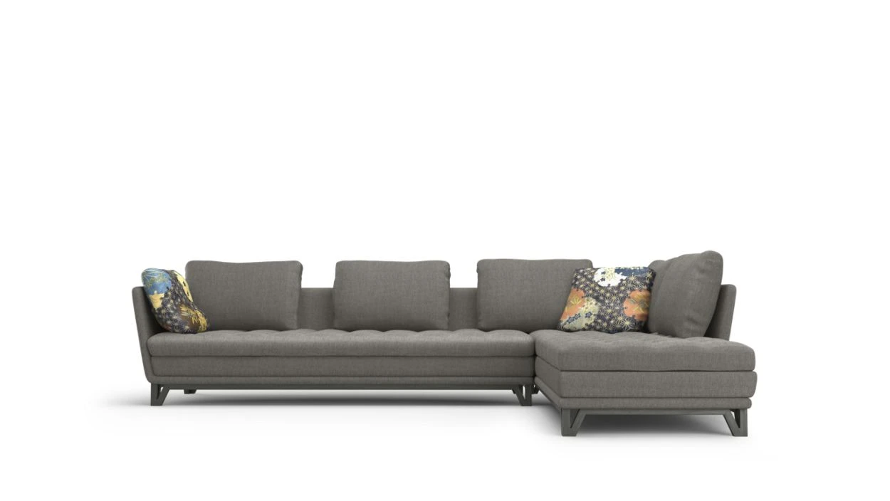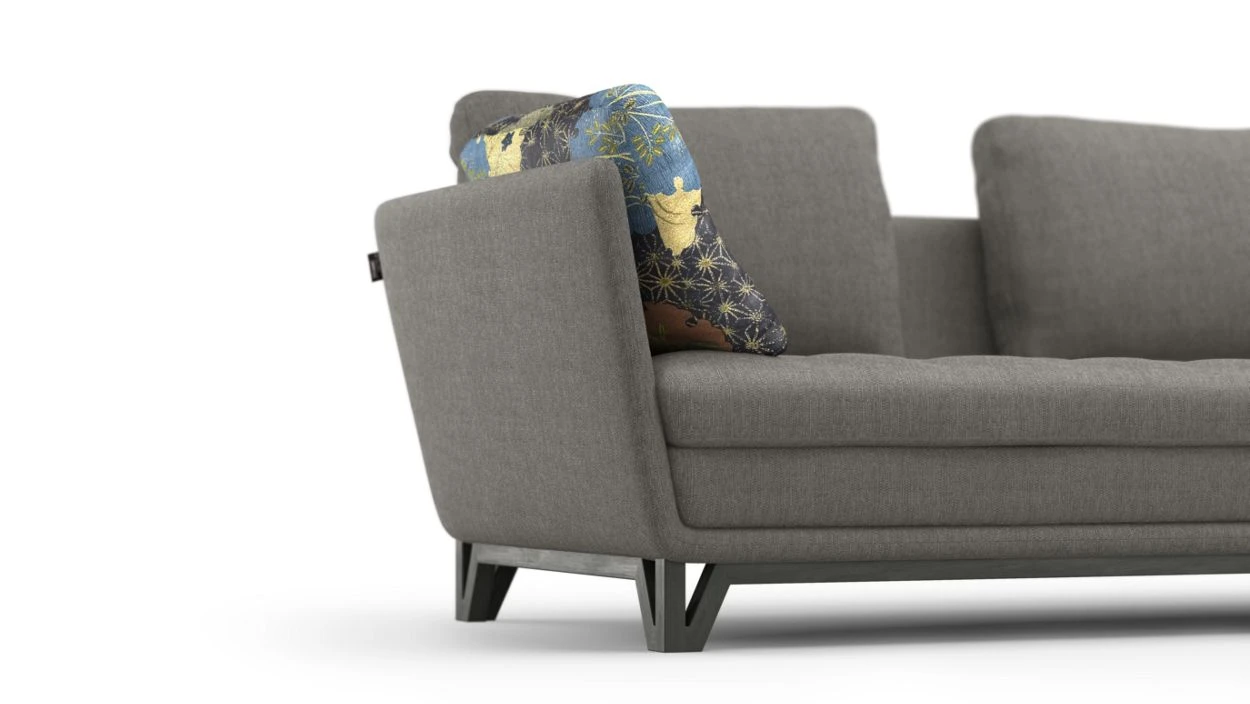 Upholstered in Kenzo Takada fabrics. Plain LITTORAL fabric, large cushions in fabric with HANAWA pattern. Optional small cushions in KAME fabric. Padded seat mattress in HR foam 35kg/m3. Back and armrest cushions in feathers and foam flakes. Structure in Beech, fir wood and poplar plywood. Cross-webbing elastic straps suspensions. Base in Wenge-stained wood. Also available in other dimensions and elements.