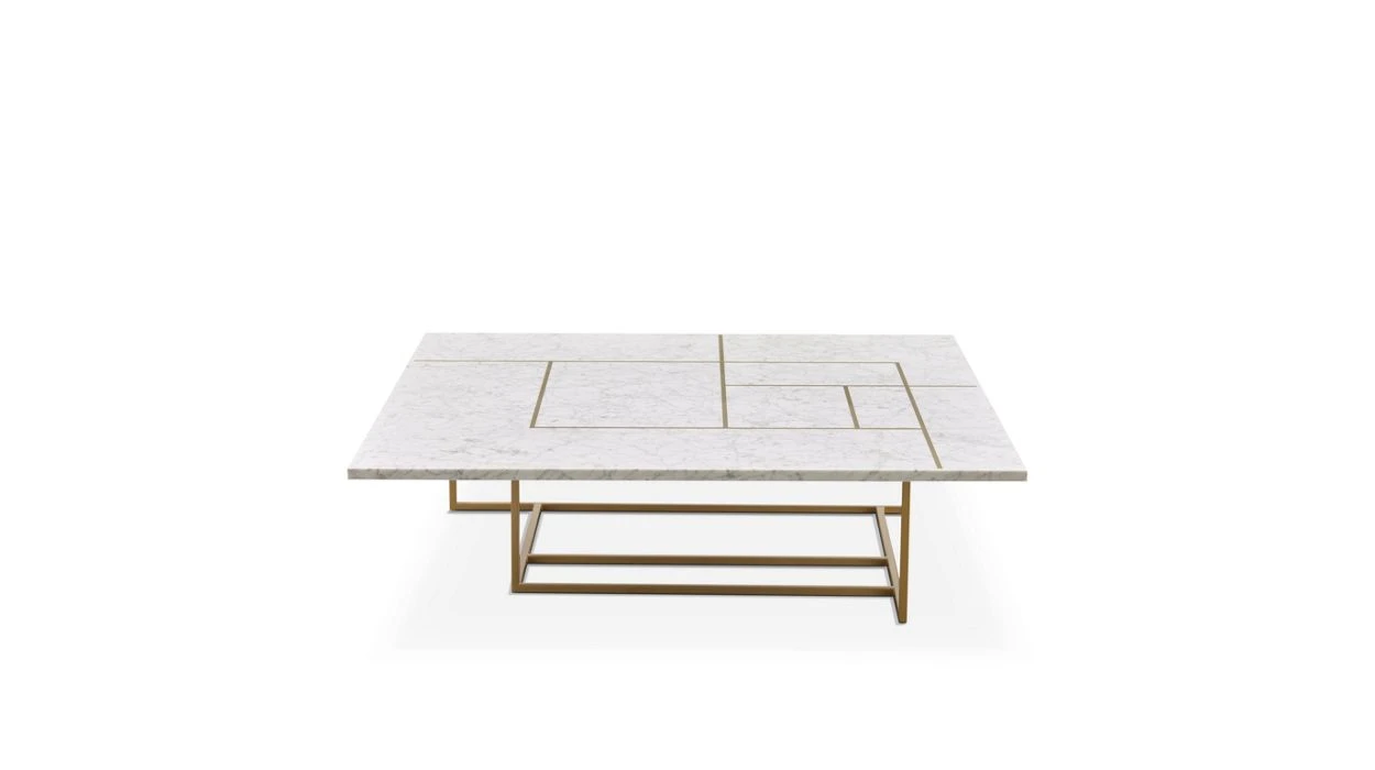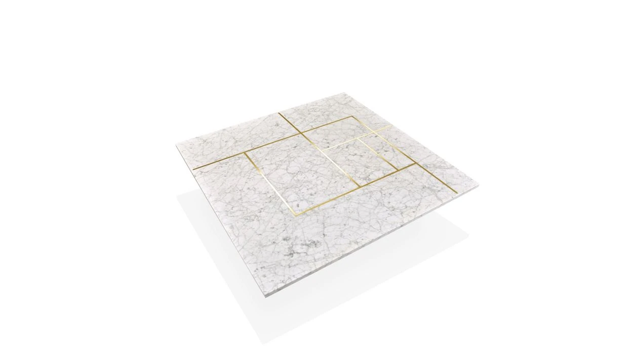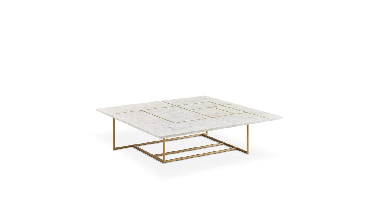 Square cocktail table, top in white Carrare marble 20mm-thick, inserts in brass finish.