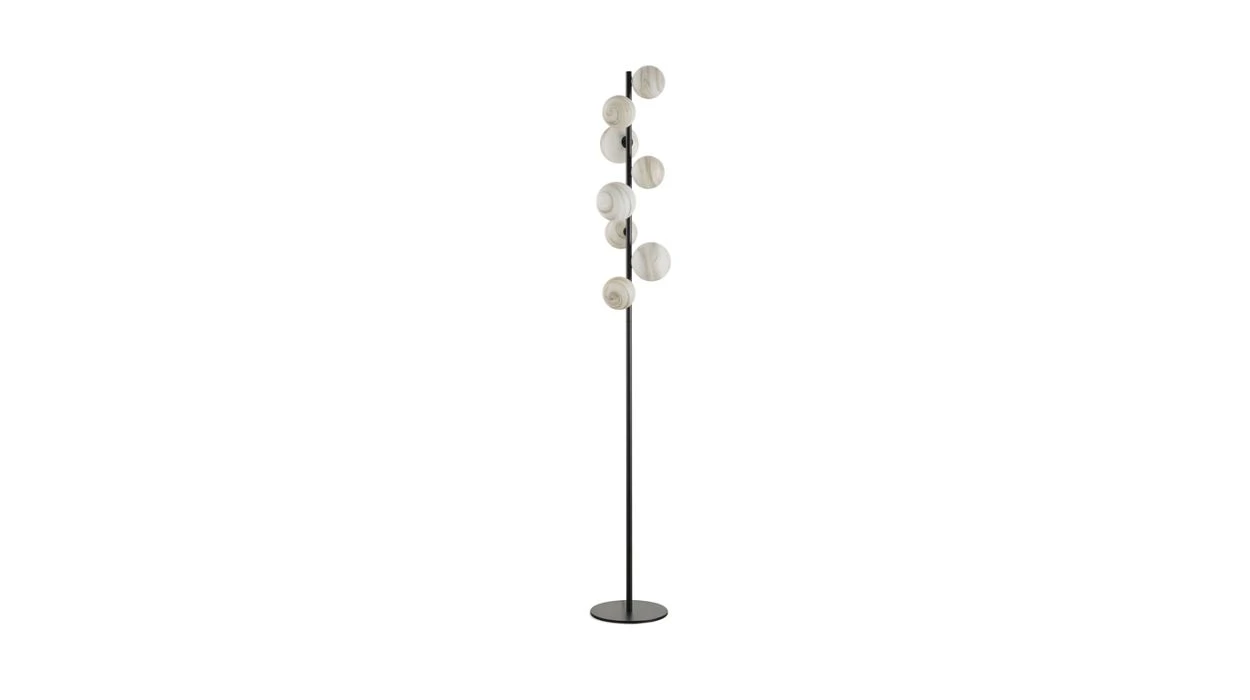 Floor lamp with steel structure in matte black lacquer and eight spheres in blown glass, alabaster effect finish. Manufactured in Europe.