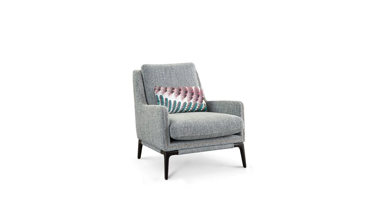 Seat cushion in bi-density HR foam 55-31 and batting. Back and armrest cushions in bi-density foam 23E-25AR and batting. Structure in stained solid beech. Elastic straps suspensions. Base in stained solid beech.