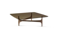Tops in 10mm-thick smoked glass, bronze finish, with rounded edges. Base in solid American walnut.
