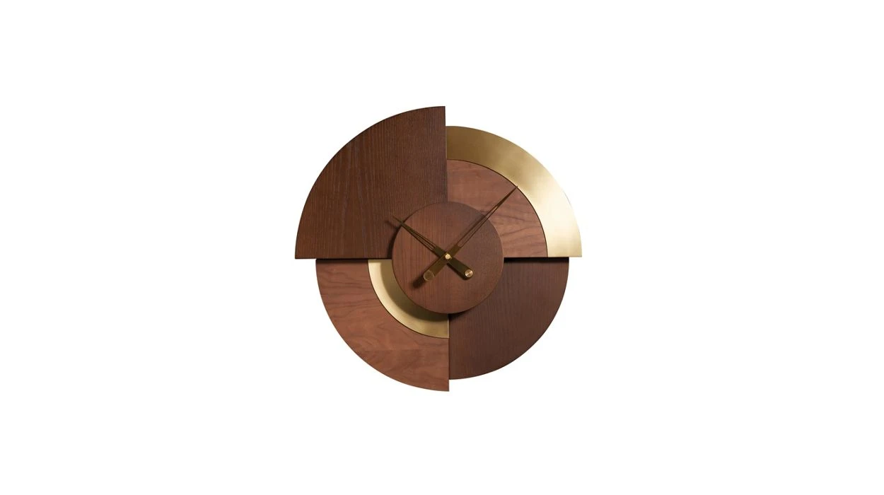 Clock in walnut veneer on MDF and brass details. Clock hands in polished brass.