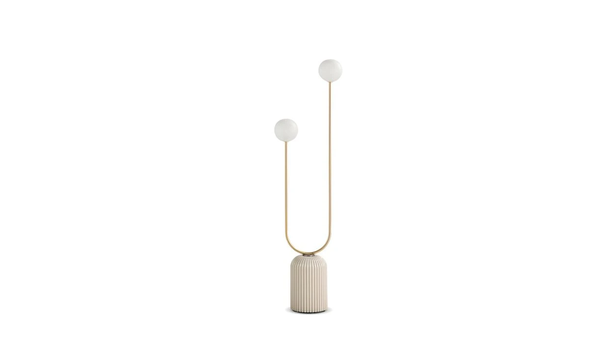 Floor Lamp with structure in anodized steel with satin brass finish, sphere in pyrex blown sanded glass. Base in riffled lacquered ceramic col. Ecru.