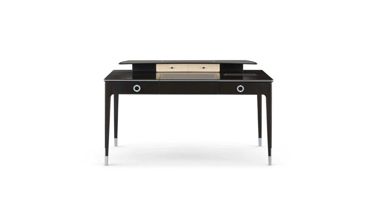 Structure and drawer fronts in solid cherry wood. Top in cherry wood veneer on engineered composite wood and frame in solid cherry wood. Drawer bottoms in sycamore veneer on engineered composite wood. Drawer unit and interior storage in solid sycamore. Rod and decorative finishes in over-stitched leather.
