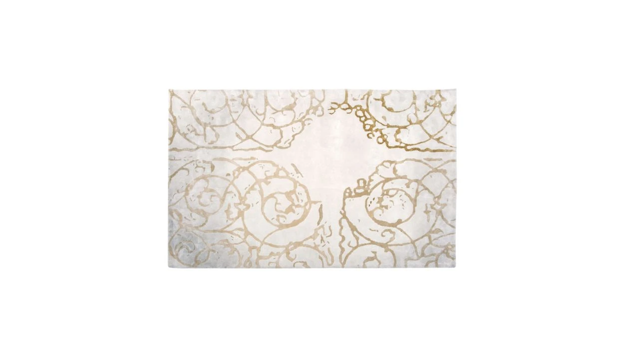This elegant and refined rug features delicate swirls in shades of beige and cream, reminiscent of the ironwork of the Roaring Twenties, Roccoco scrolls or Indian artwork.