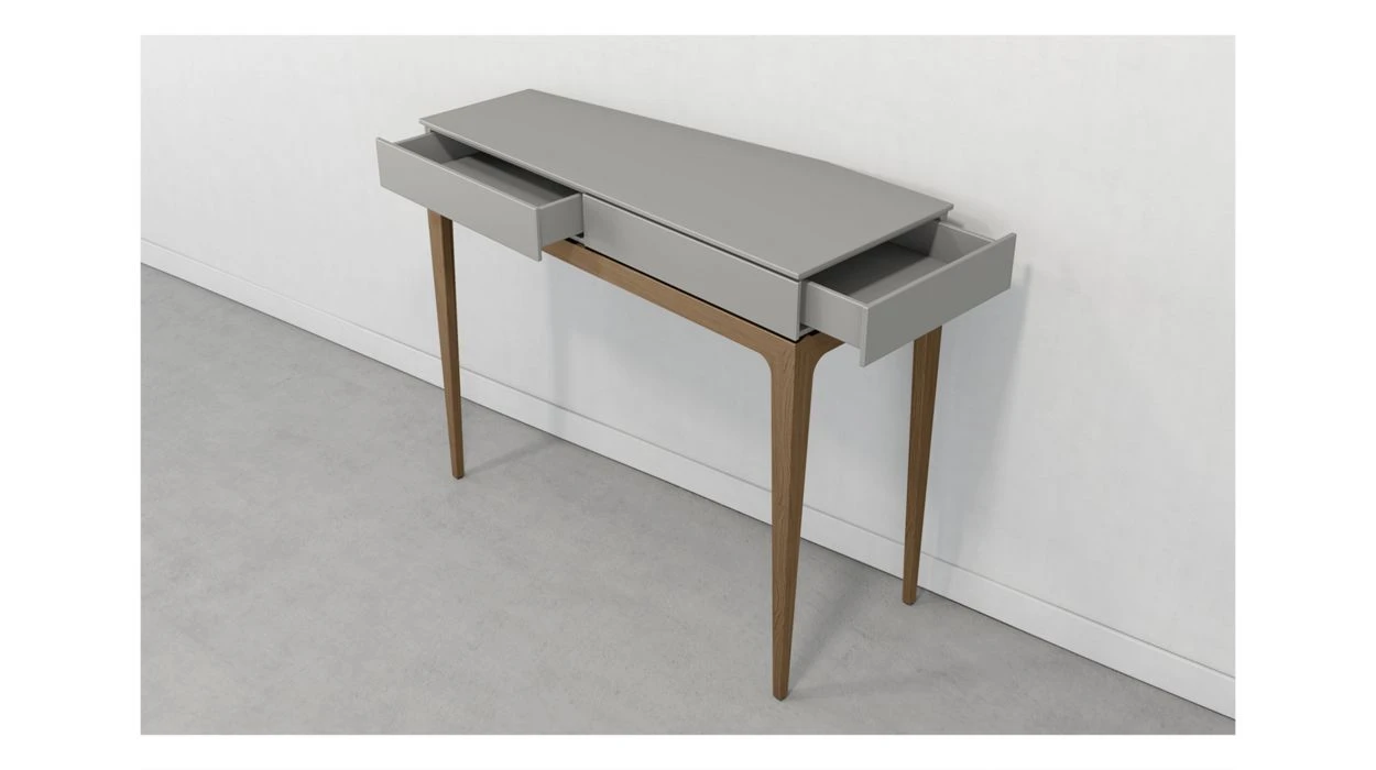 Asymetrical three-legged console, top with 2 drawers in MDF with matte lacquer finish, base in stained solid oak. Many finishes available.
