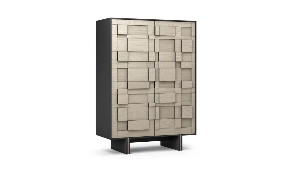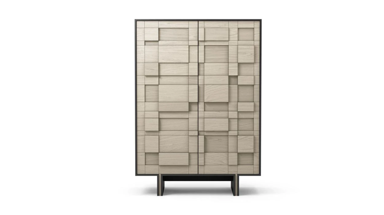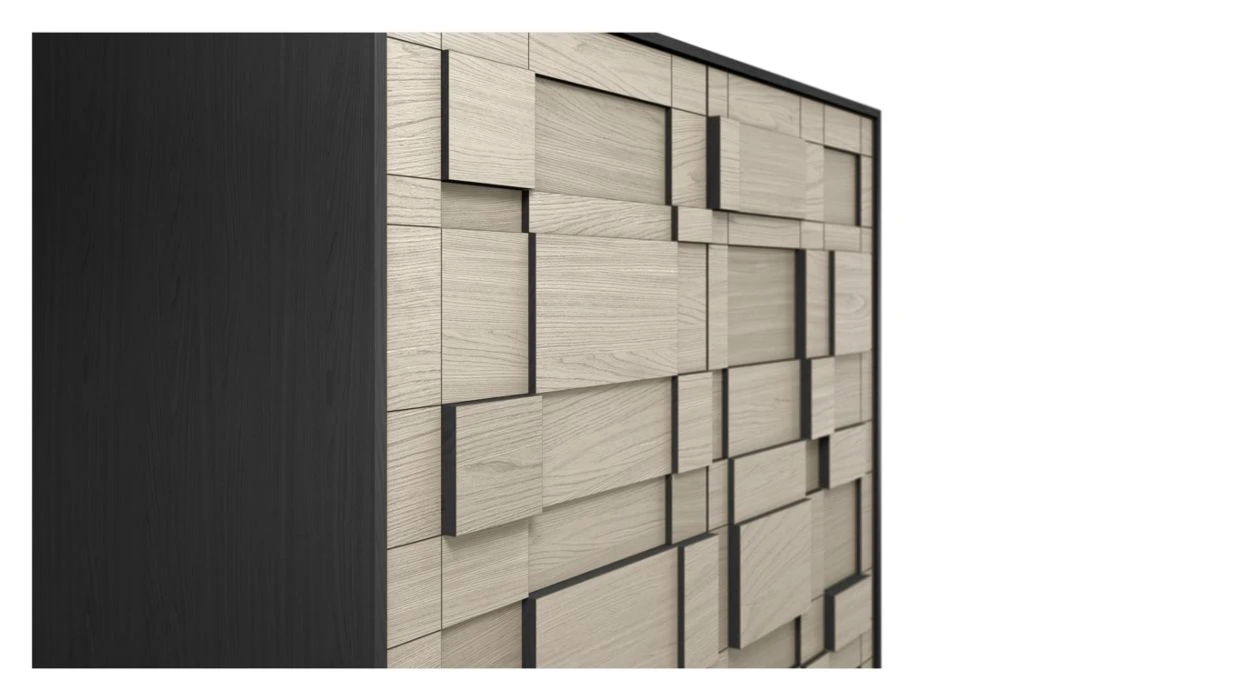 In his creations, designer Erwan PĂ©ron seeks to “give meaning and create emotion”. The facades of the Nat collection feature multiple pieces of wood of different depths. The protruding pieces are outlined in black to highlight the three-dimensional look. This work of contemporary marquetry is done by hand and showcases the natural variations of the oak. It’s unique, but also very refined.
