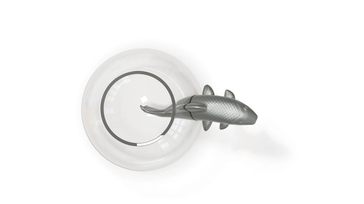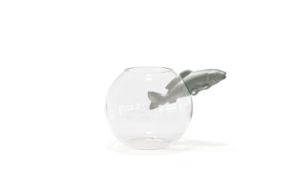 Vase in mouth-blown glass and fish in silver enameled porcelain.