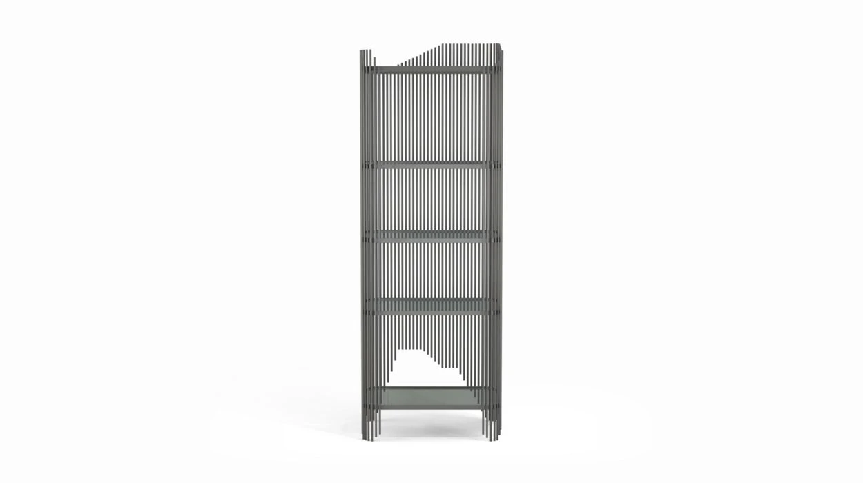 This graphic collection represents the patterned movement of a sound wave, with its silences and saturations. A semi-transparent wavy shape is created using an alignment of metal rods, surrounding the smoked glass trays.