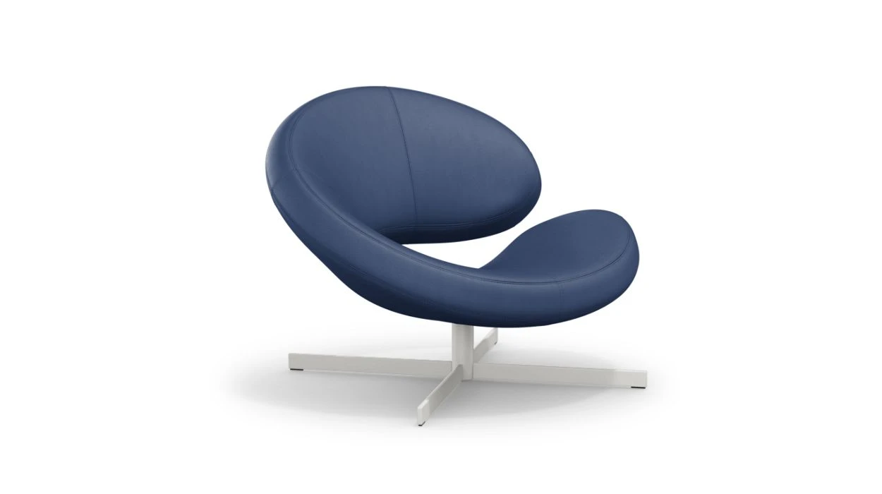 Upholstered in TENDRESSE leather, European cowhide, corrected embossed grain, pigmented finish. Seat and back cushions in HR foam 40kg/m3. Structure in metal. Pivoting base in lacquered or chrome-plated metal with automatic return function and memory position.