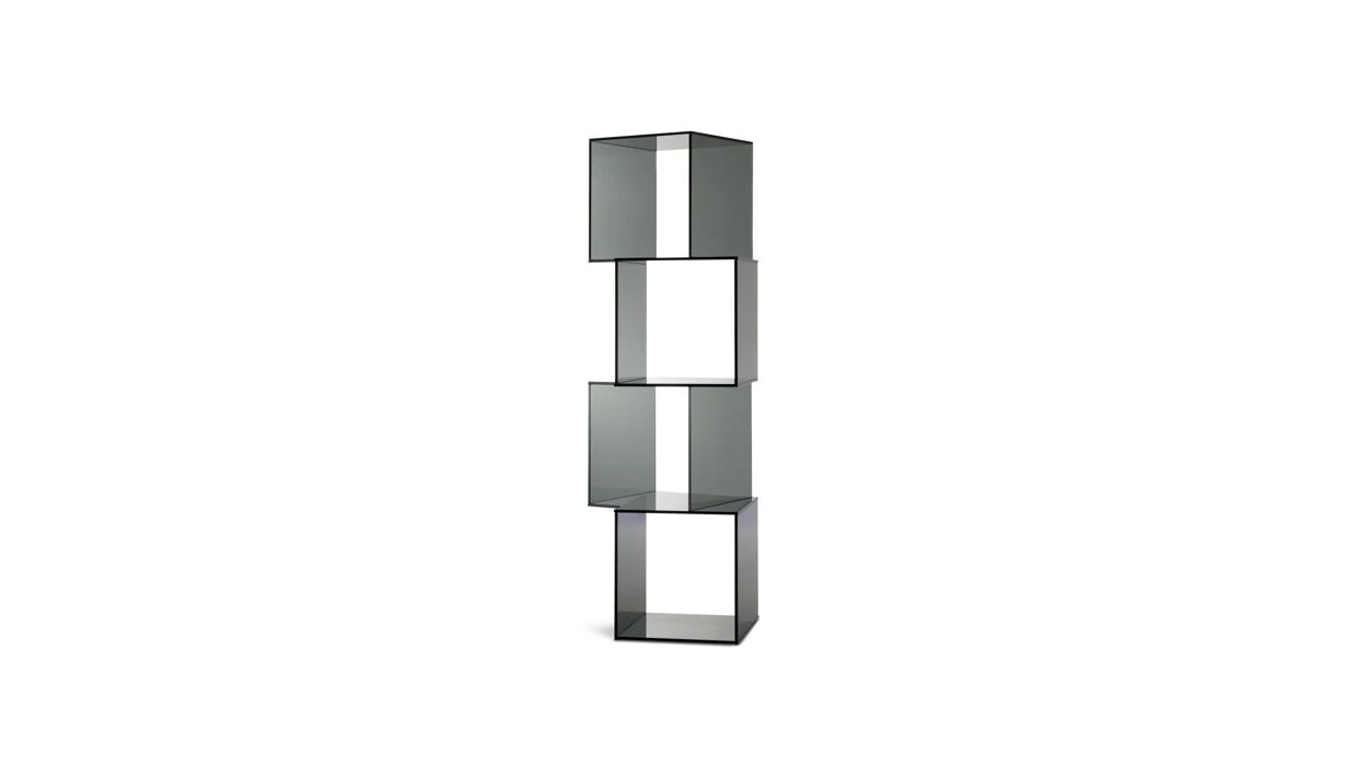 Bookcase with 4 levels in 12mm-thick extra clear glass, vertical panels in 10mm-thick smoked glass, col. grey.