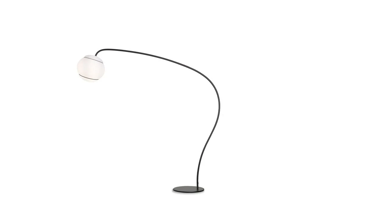Floor lamp with dimmer. Structure in matte black lacquered metal and lampshade in blown glass.