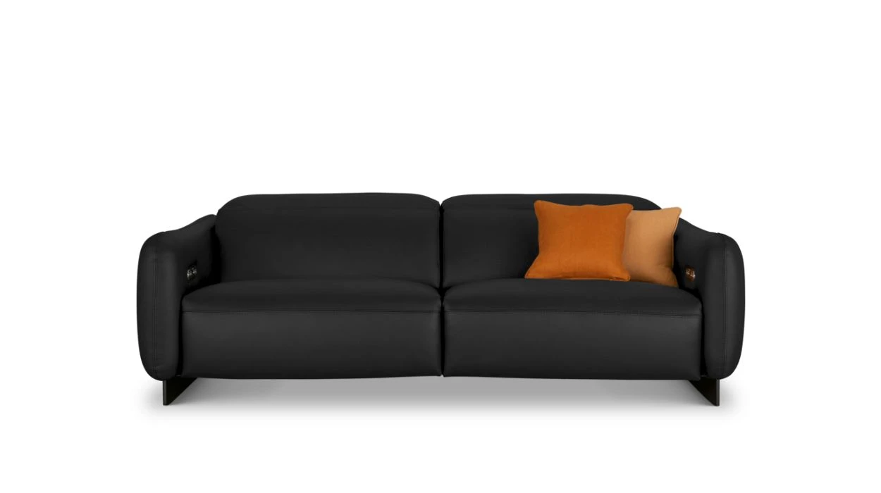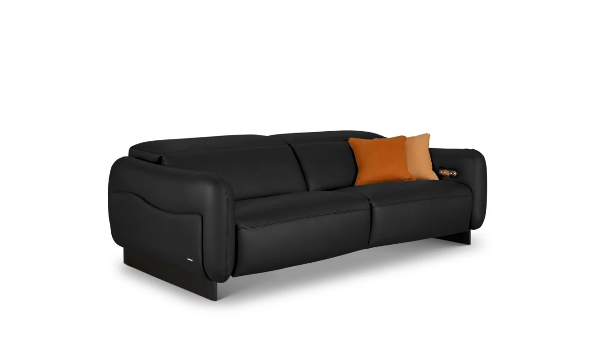 Upholstered in Ricochet fabric (56% acrylic, 15% polyester, 12% viscose, 11% cotton, 6% linen). Multi-position electric mechanism, which transforms each seat into a lounge chair – 2 motors per seat, digital control unit embedded in the armrest. Back cushions and headrest in polyurethane foam 21 kg/m³. Seat cushions in HR polyurethane tri-density foam 35-21-25 kg/m³. Structure in solid fir wood, pine plywood and particle board. Extra large HR elastic straps cross webbing suspension. Base in solid beech slats in black lacquer finish. Other dimensions also available. Optional deco cushions.