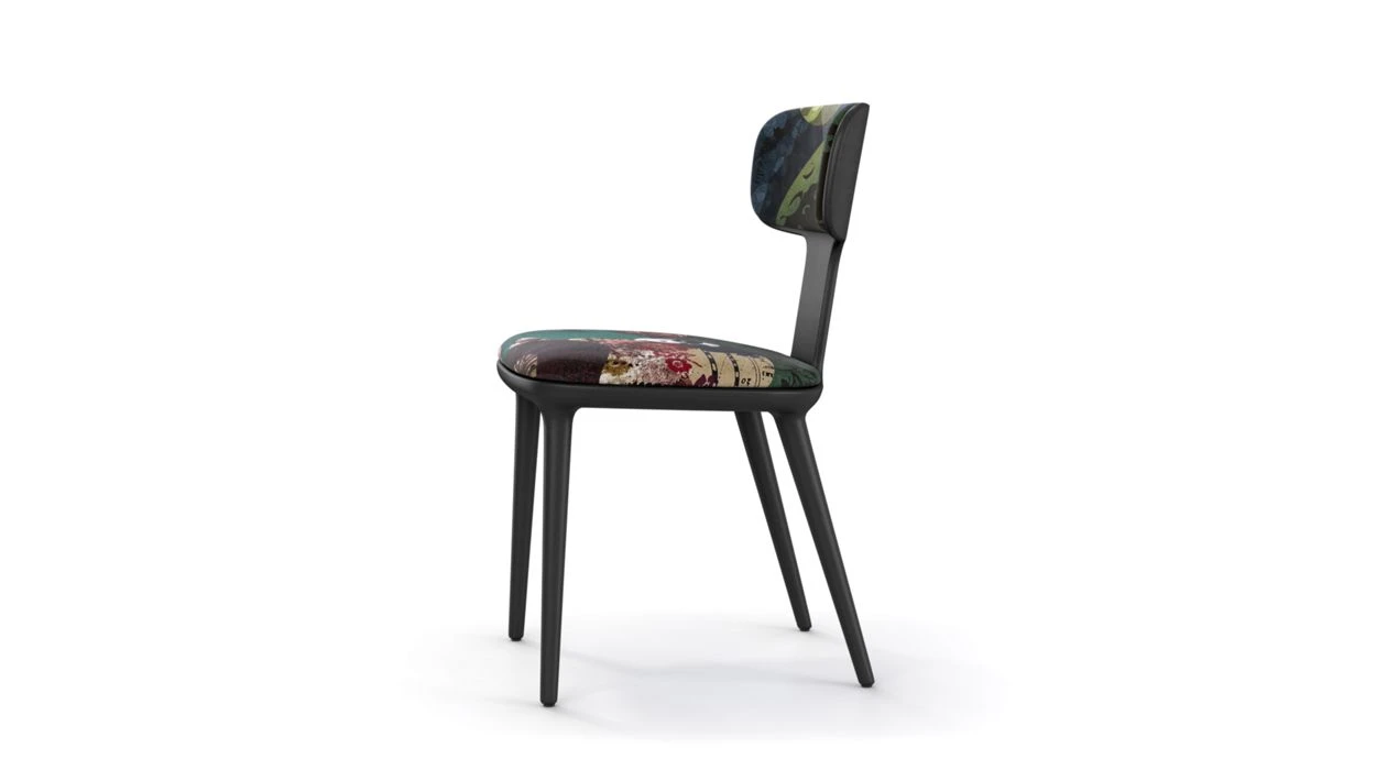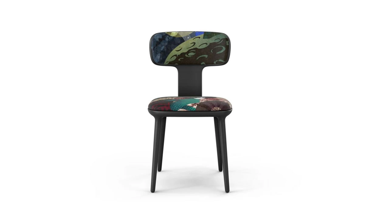Chair in ash wood veneer on plywood and solid ash wood with matte lacquer finish (many colours available). Seat cushion filled with polyurethane foam 40kg and back with polyurethane foam 30kg upholstered in fabric from the Marcel Wanders collection for Roche Bobois.