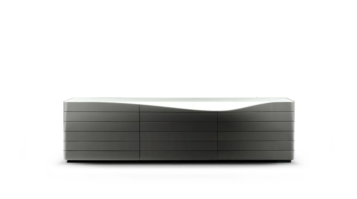 It appears as if something inside this sideboard were pushing the facade out to create a curved surface. These curves are highlighted by the six different layers. The two large side doors give access to generous storage areas, and frame a centre piece featuring a drawer and a storage chest.