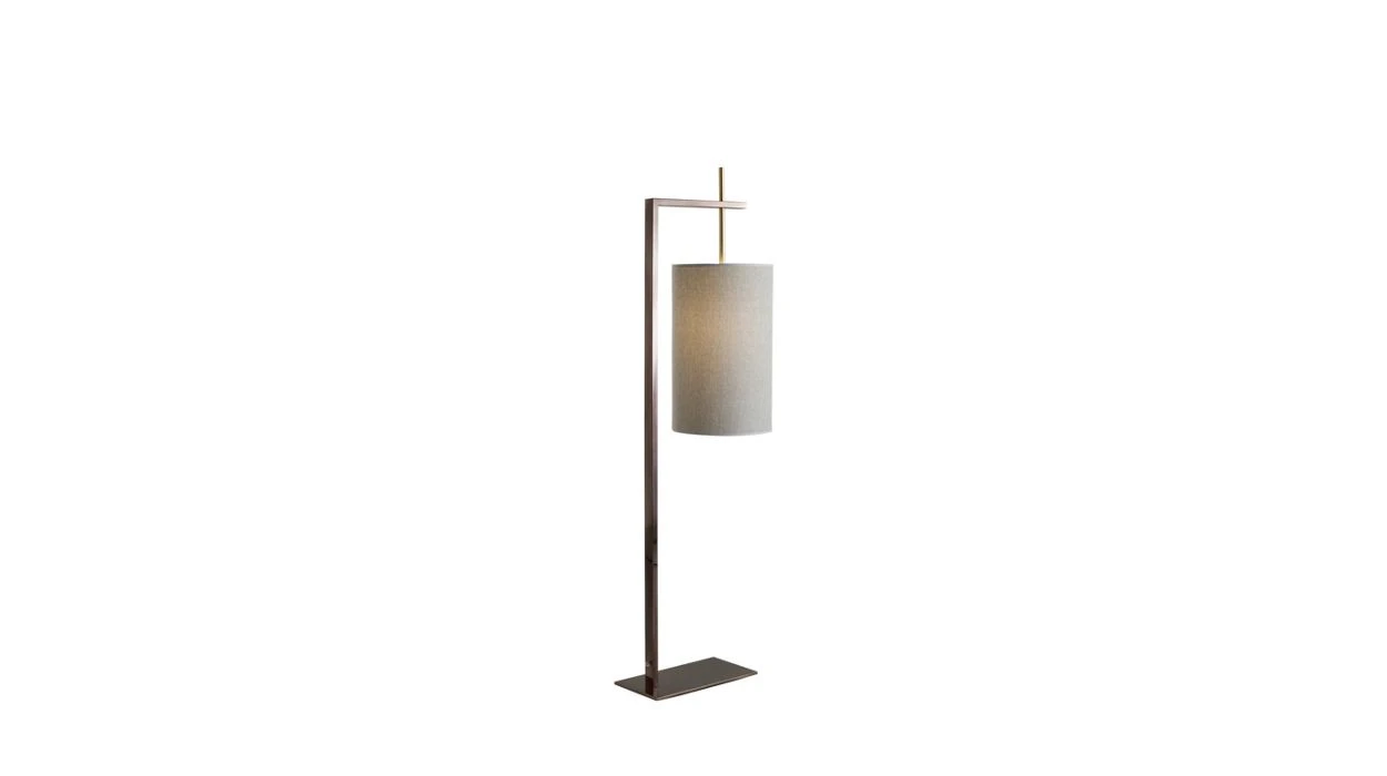 Floorlamp in metal col. Canon de fusil and brushed brass, lampshade in light grey Chiné jean.