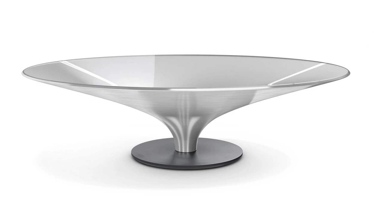 The unique cone shape of the OVNI cocktail tables appear as if the centre is being pulled downwards, and the thin concentric stripes create movement. The refined shape extends harmoniously to the base and is balanced by a lacquered steel disc at the bottom. This design by Vincenzo Maiolino is available in many diameters, heights, and finishes.