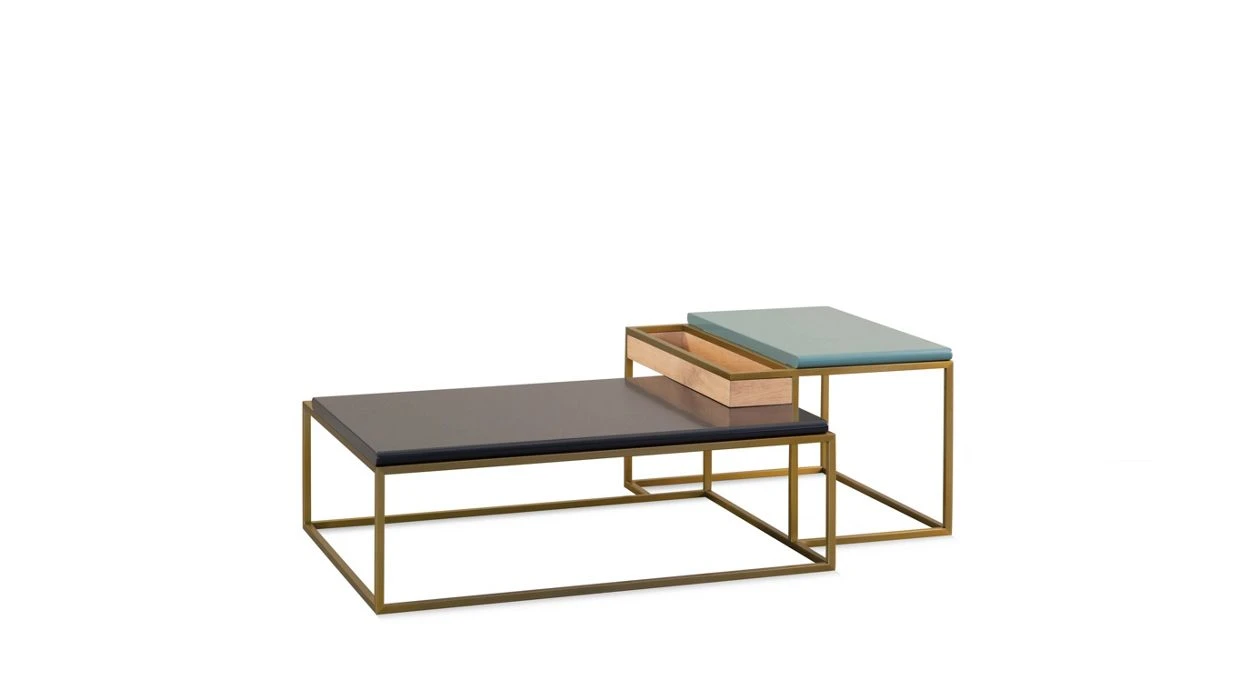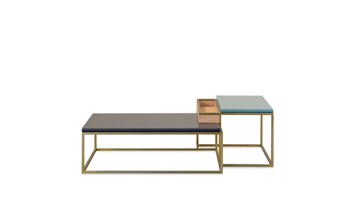 Structure in stainless steel with gilded varnish finish. Central unit in oak veneer on plywood and top in lacquered MDF (many colors available).