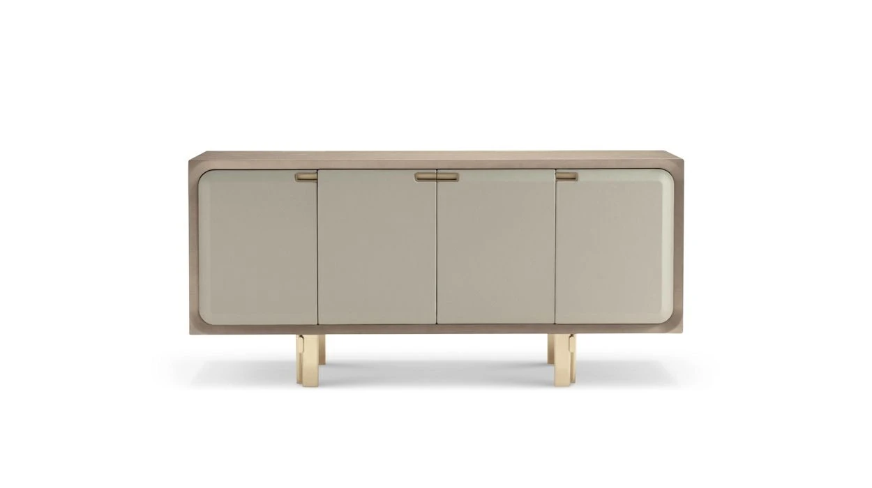 Structure in “curved” sycamore veneer on MDF, doors in plywood covered with TENDRESSE leather, lacquered interior with warm white LED light, 2 drawers with push-to-open system, metal rails, 4 removable wooden shelves (pegs), feet and handles in stainless steel with gilded lacquer finish.