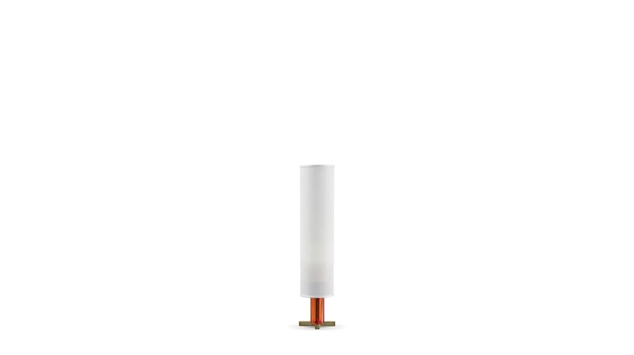 Table lamp with structure in metal, with deep-coloured glass and lampshade in cotton.