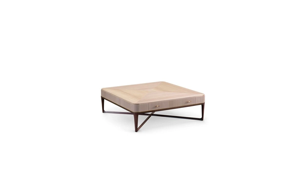 Top in Tilia veneer with stain finish (2 stains), interior in sycamore veneer. Base in solid sycamore and handles in brass and walnut.