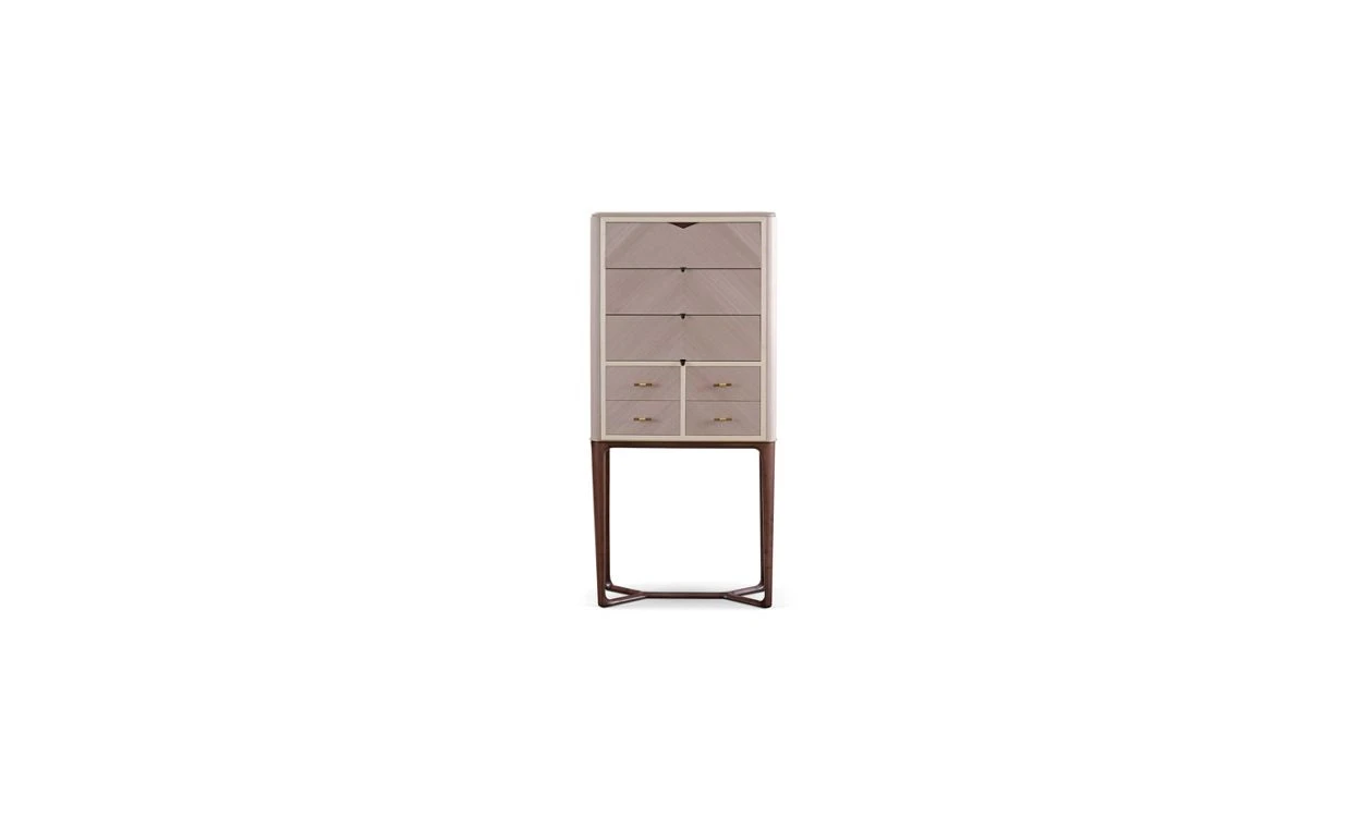 Fronts in Tilia marquetry with stain finish (2 stains), interior in sycamore veneer and base in solid sycamore and handles in brass and walnut.