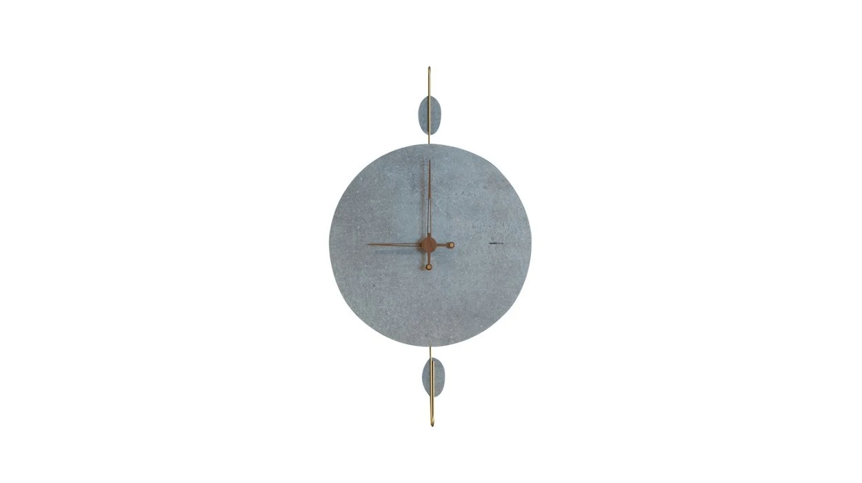 The PIEDRA clock collection was inspired by swinging pendulums. The roughness of the stone contrasts beautifully with the delicate polished brass. These clocks appear to be very light, as if they were floating in the air.