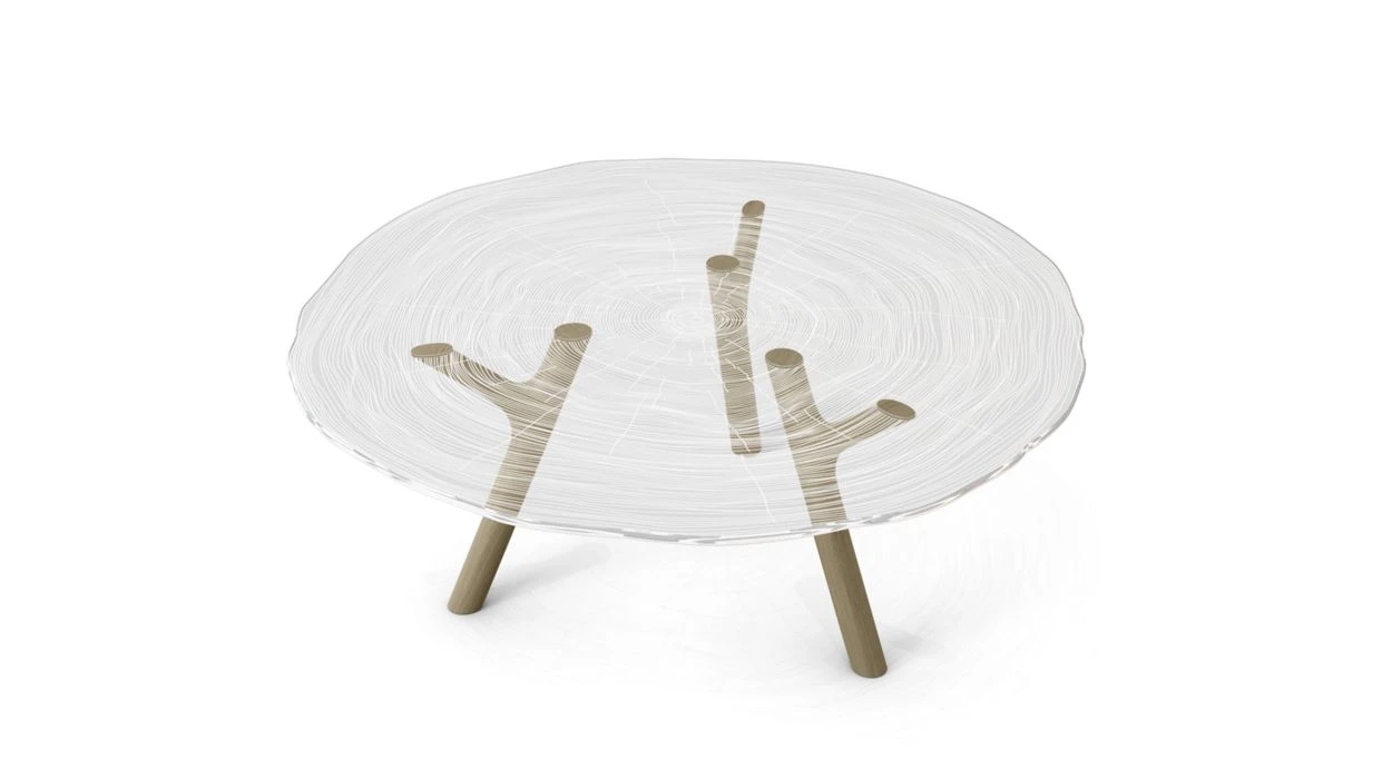 Antoine Fritsch & Vivien Durisotti combined different materials and techniques to create this collection that resembles the organic forms found in nature. The solid oak base is created by hand and the transparent Altuglass® top is delicately engraved to resemble the veining of a cut log.