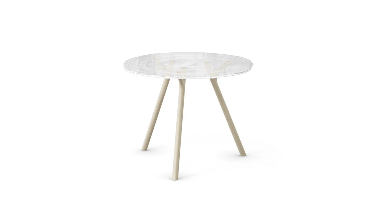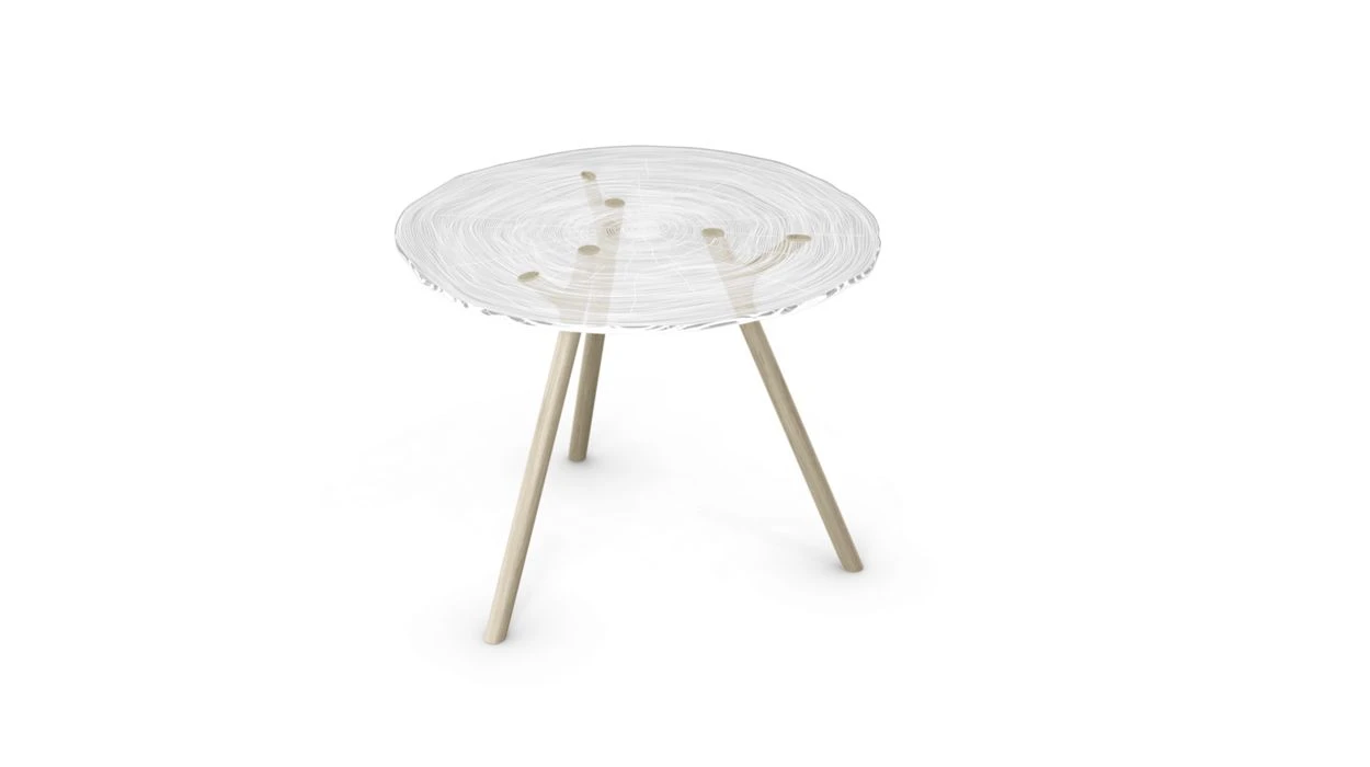 Antoine Fritsch & Vivien Durisotti combined different materials and techniques to create this collection that resembles the organic forms found in nature. The solid oak base is created by hand and the transparent Altuglass® top is delicately engraved to resemble the veining of a cut log.