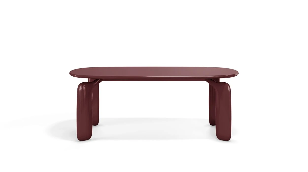 Each table leg resembles a glossy, malleable material that extends a tentacle to the table top without touching it. The top is also designed to resemble a cell that has been sliced open horizontally. It is clad in Fenix® veneer in the same color with a matte finish, which guarantees multifunctional use.