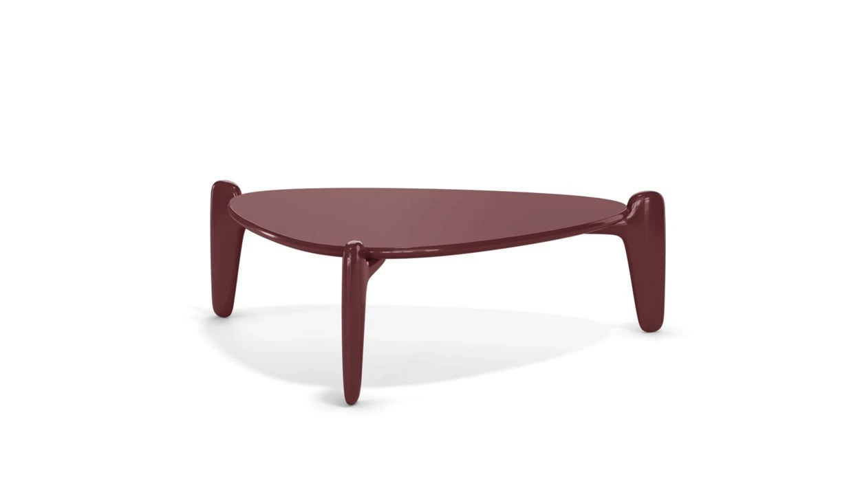 The cocktail tables and end tables feature round or rounded triangle tops, and are available in two sizes and heights, as well as in lacquer or wood.