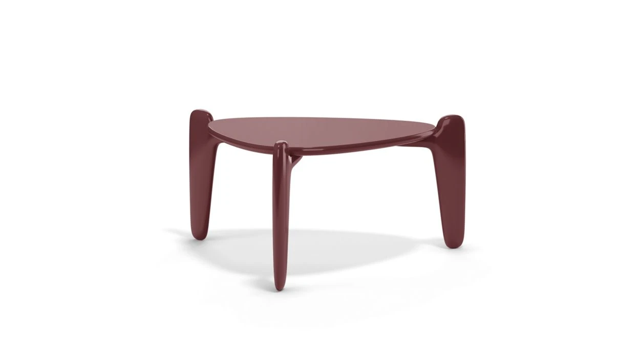 The cocktail tables and end tables feature round or rounded triangle tops, and are available in two sizes and heights, as well as in lacquer or wood.