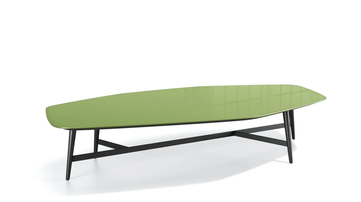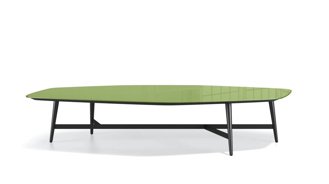 Cocktail table with top shaped as an irregular pentagon (many finishes available), base in steel with black lacquer finish.