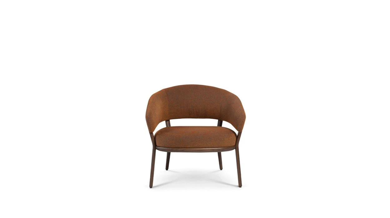 Lounge armchair with solid ash wood structure in stained finish (several colors available), seat and back covered with polyurethane foam HR35 and HR40 and polyester wadding 100/gr/m2. Upholstered in fabric, leather-like fabric or leather (many colors available).