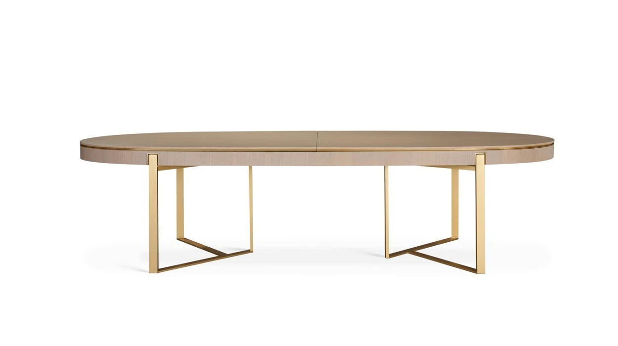 Belt in Gouge-stained oak veneer on plywood and MDF, top in oak veneer on MDF, surrounding edge and legs in MDF with brass lacquer finish, metallic structure in brass with lacquer finish.