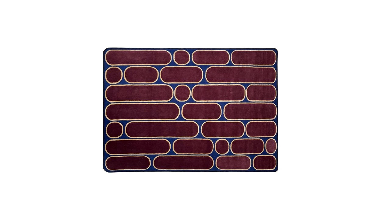 This rug was imagined as a graphic construction game, where rounded shapes and vertical lines fit together and invade the space by their accumulation, creating a structure in movement. RIA features a palette of indigo blue and deep plum colors, along with touches of gold, giving this rug a rich and luminous look.