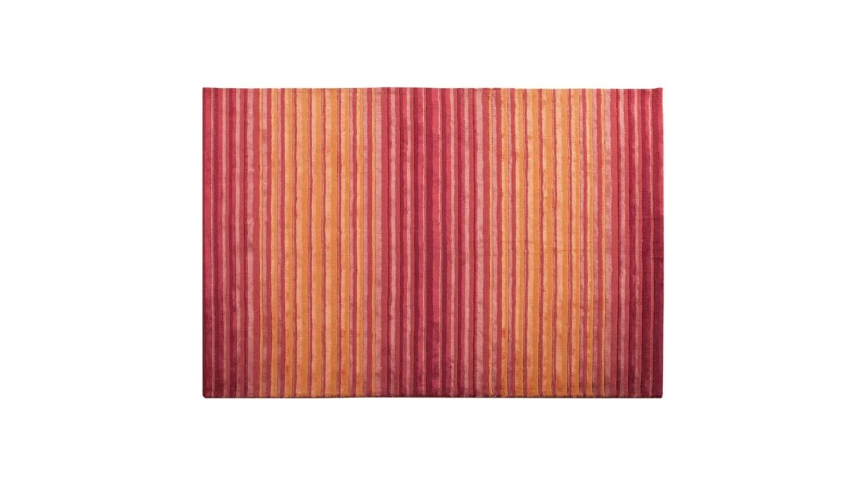 Hand-tufted rug, col. red and orange, mix of virgin New Zealand wool and viscose. Gradation of stripes with ruptures of material.