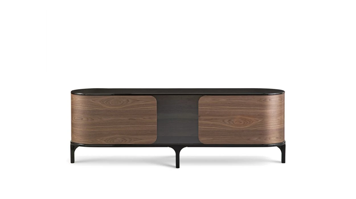 This sideboard evokes the idea of metamorphosis. In beech and walnut veneer, it features two cylinders that pivot open to give access to a central display.