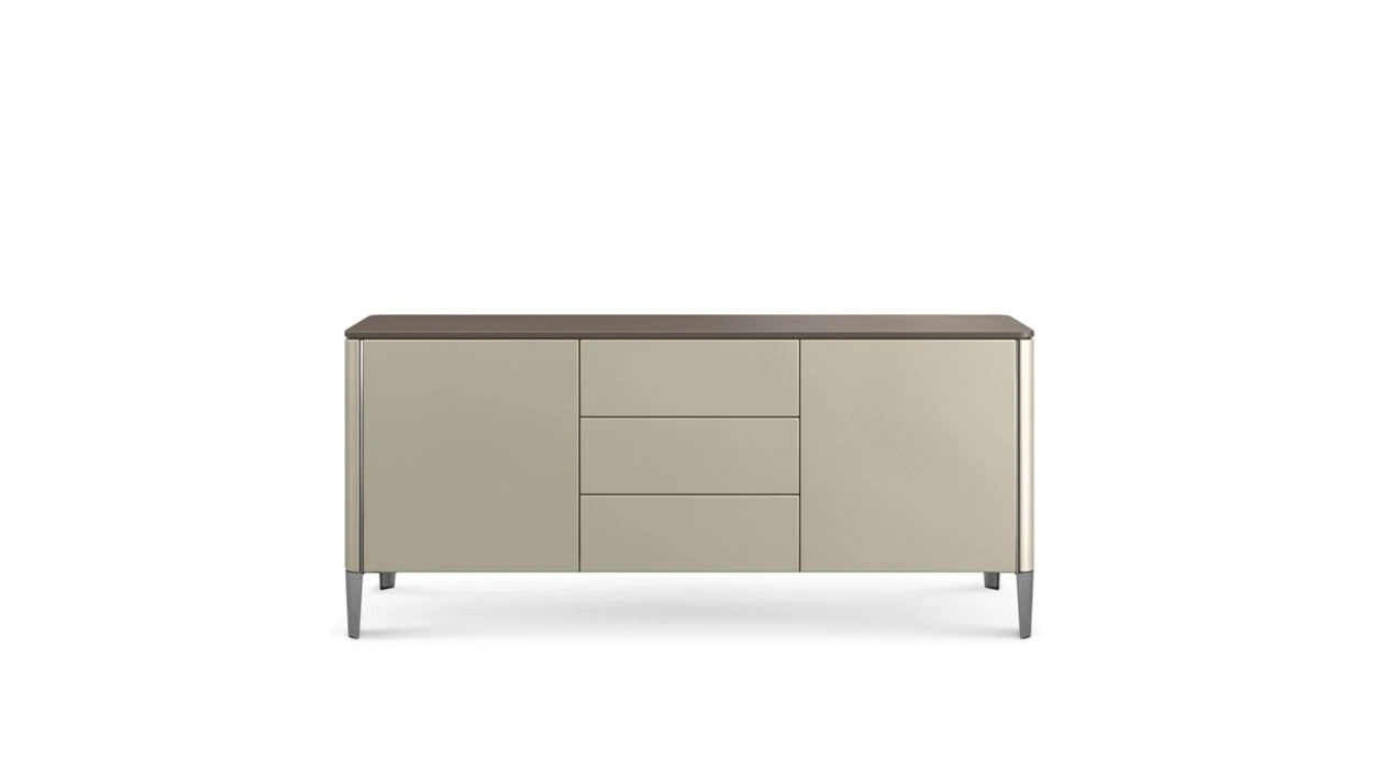 Sideboard with 2 doors, 3 drawers, structure in lacquered MDF or in veneered Alpi® (reconstitute veneer) with a top in a choice of matte lacquer, lacquered glass, Alpi veneer or ceramic. Legs in black chrome-plated steel.