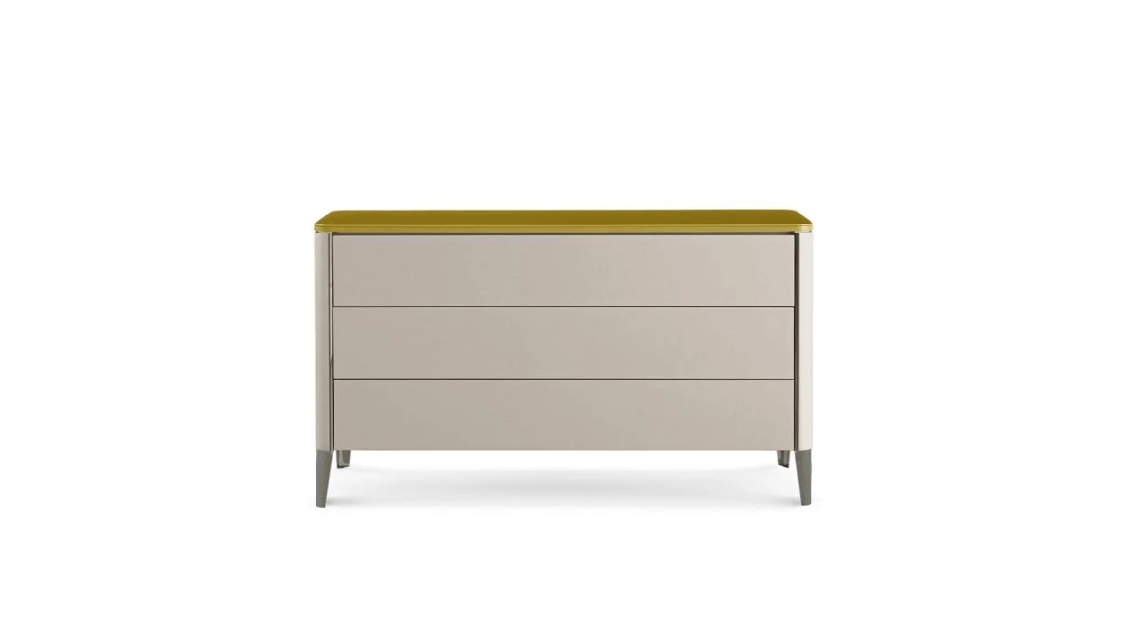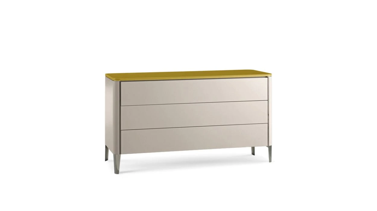 Chest of drawers with 3 drawers, structure in lacquered MDF or in veneered Alpi® (reconstitute veneer) with a top in a choice of matte lacquer, lacquered glass, Alpi veneer or ceramic. Legs in black chrome-plated steel.