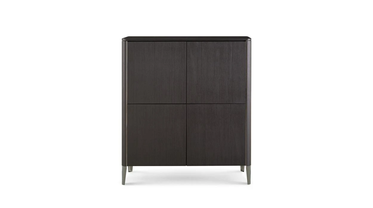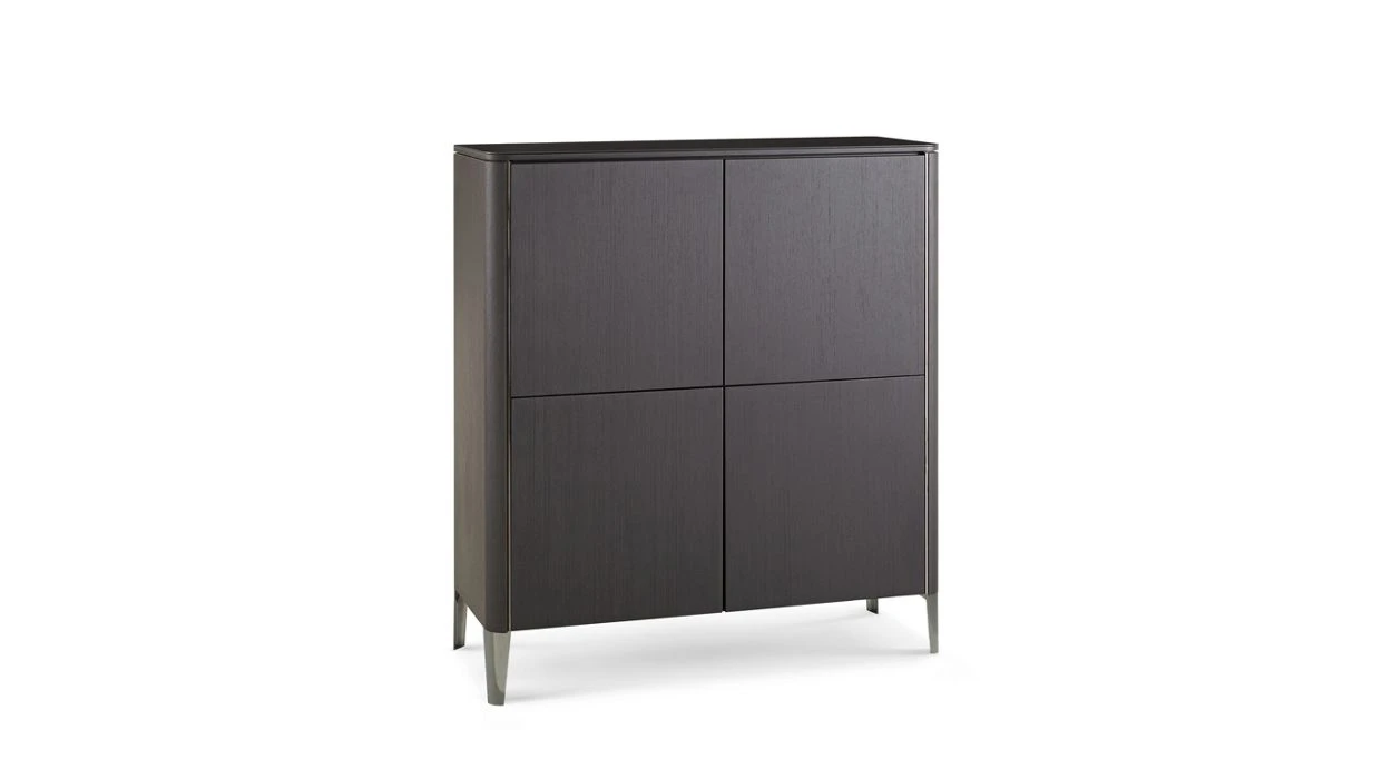 China unit with 4 doors, structure in lacquered MDF or in veneered Alpi® (reconstitute veneer) with a top in a choice of matte lacquer, lacquered glass, Alpi veneer or ceramic. Legs in black chrome-plated steel.